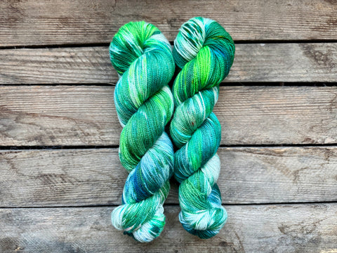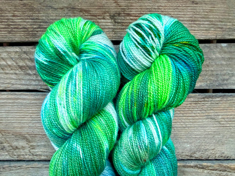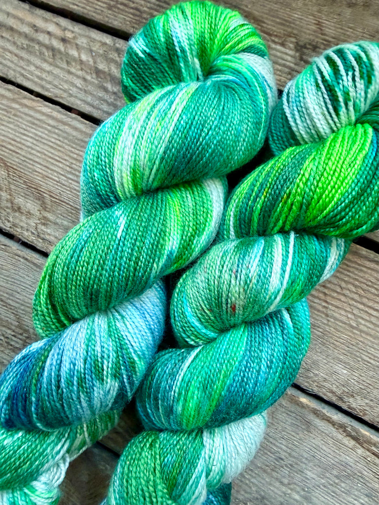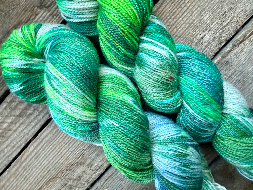 This 100 gram skein is made out of 70% Superwash Merino, 20% Nylon and 10% Bronze Stellina and this base is spun with a normal twist.
