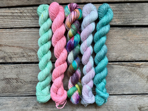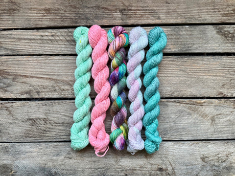 Which contains 5 x 20 gram mini Skeins on our Bronze Stellina Sock base.